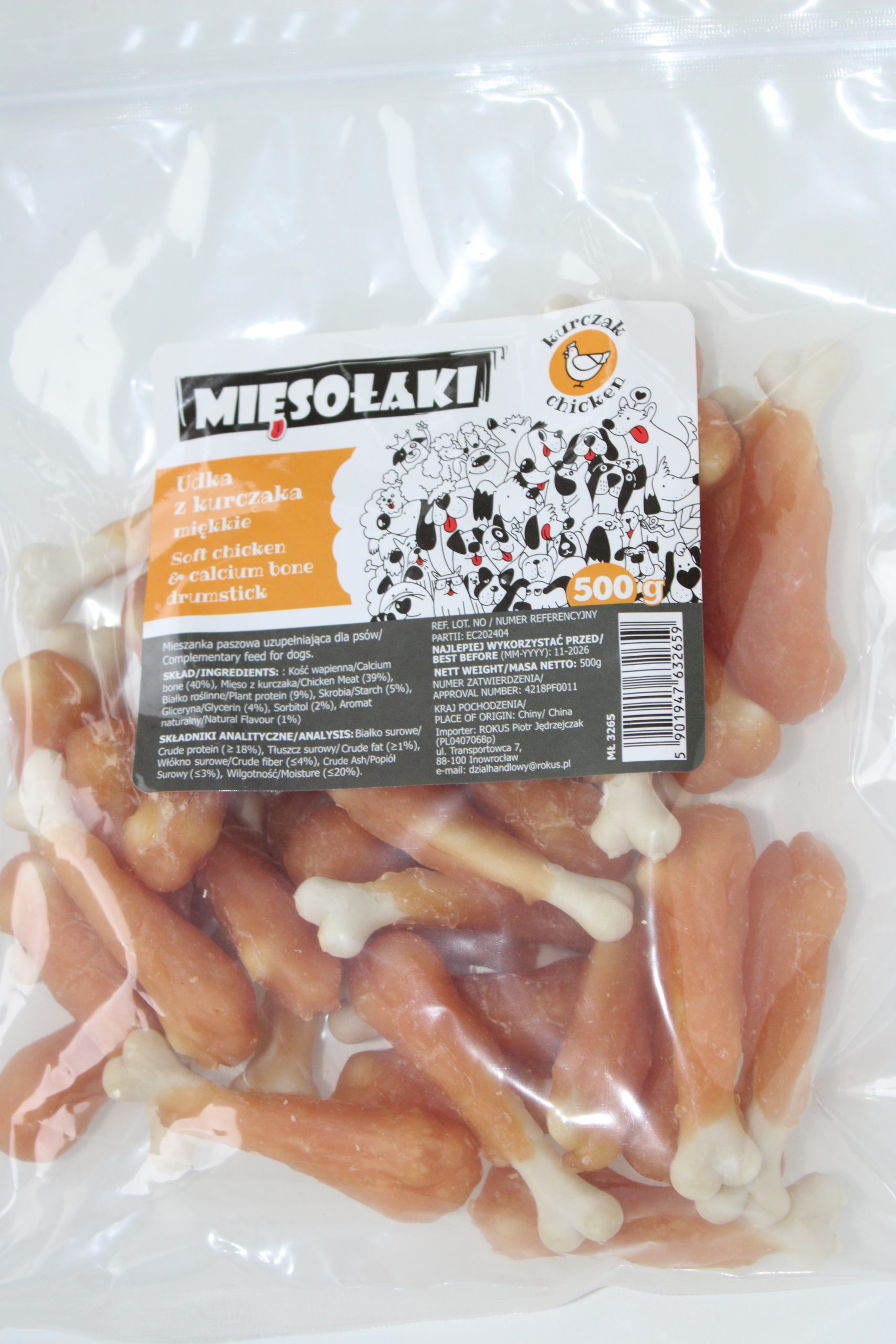SKŁAD/INGREDIENTS: Kość wapienna/Calcium bone (40%), Mięso z kurczaka/Chicken Meat (39%), Białko roślinne/Plant protein (9%), Skrobia/Starch (5%), Gliceryna/Glicerin (4%), Sorbitol (2%), Aromat naturalny/Natural Flavour (1%)